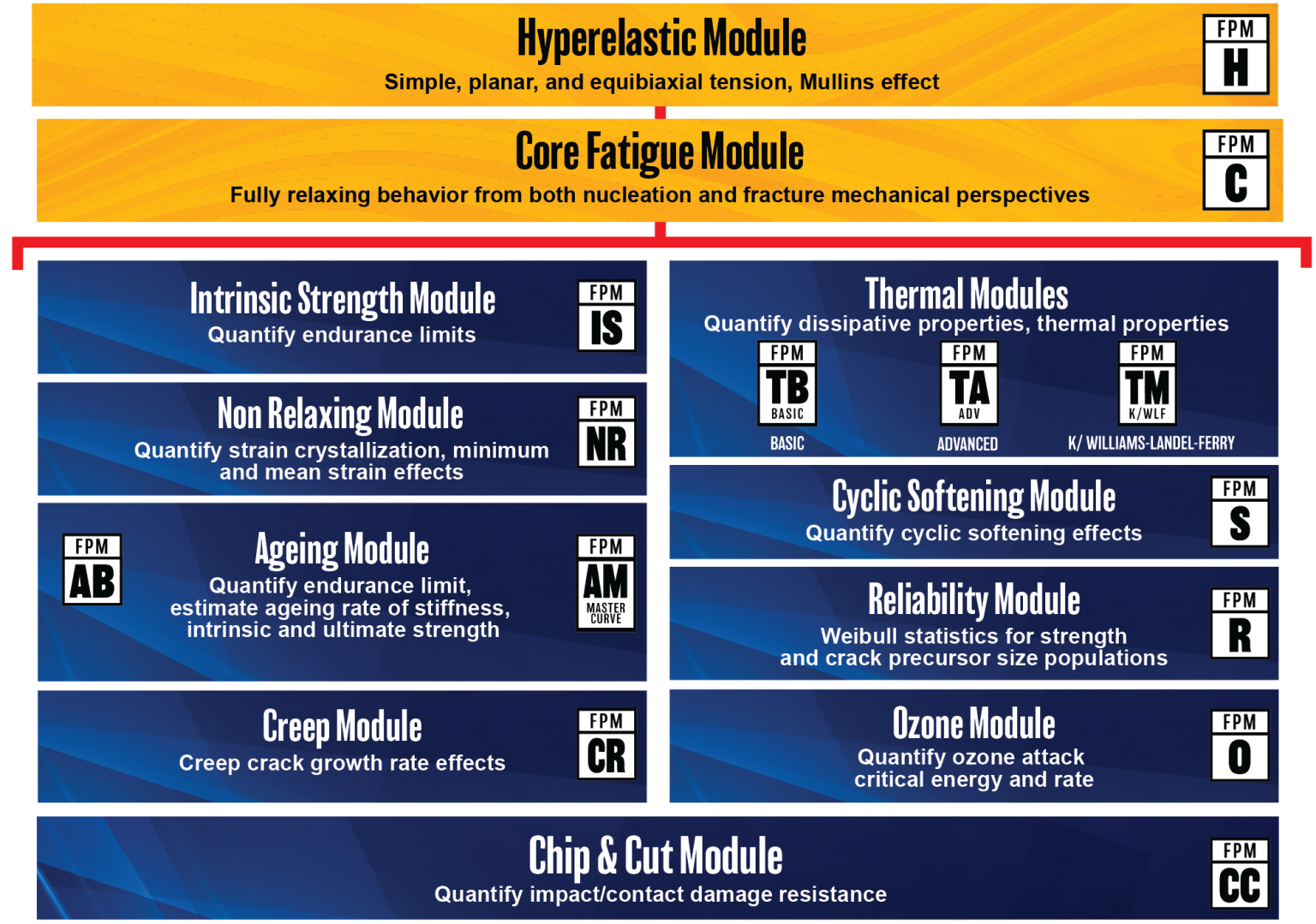 While the Hyperelastic Module and the Core Fatigue Module are mandatory for any test, you can build a testing regimen that’s specific to your material to get the physics right.